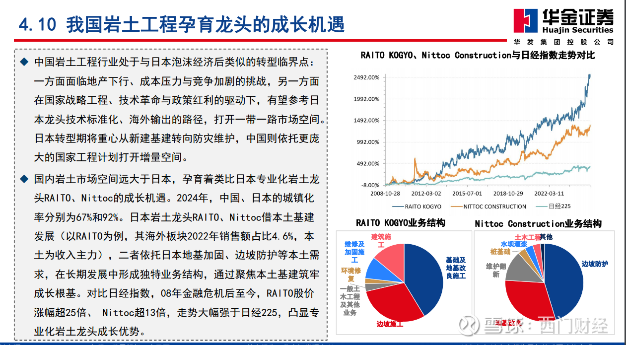 他山之石,岩土工程大有可为。日本岩土工程在泡沫经济后,通过技术革新、市场重构与战略调整实现转型,核心是以技术深耕替代规模扩张、跨领域融合开辟新市场,诞生Raito、Nittoc等专业化岩土工程龙头,其路径表明行业需从“建造者”升级为“重大问题系统解决者”。中国岩土工程行业处于类似的转型临界点,有望参考日本龙头技术标准化、海外输出的路径,打开一带一路市场空间。行业集中度提升趋势下,看好以技术立身,契合国家战略方向的国内岩土工程企业的成长空间。