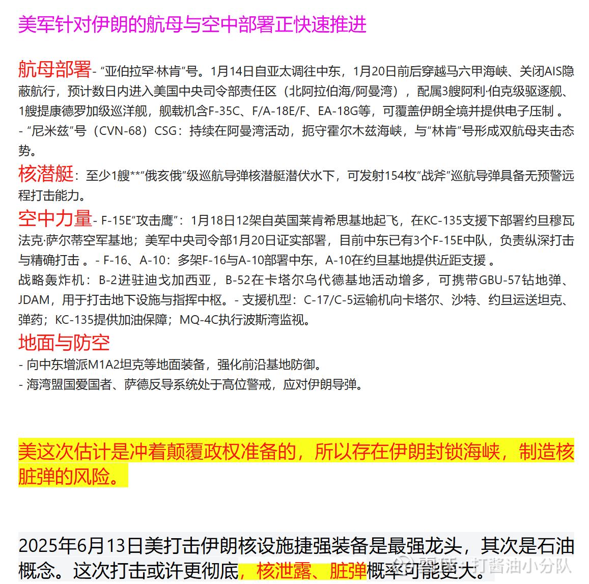 美这次估计是冲着颠覆政权准备的,所以存在伊朗封锁海峡,制造核脏弹的风险。