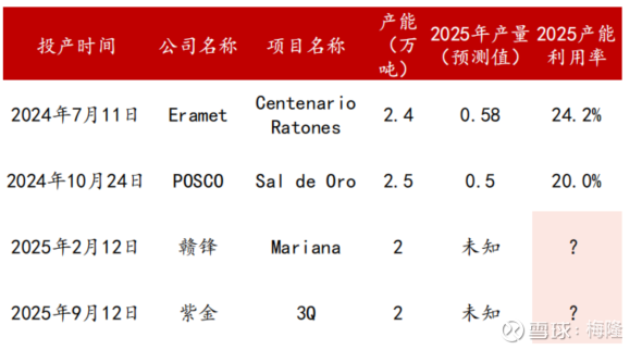 2024H2-2025H1为阿根廷盐湖产能集中投产年,产能爬坡两年;受锂资源投资周期影响,26年新增项目少,确定性较高的应该是赣锋锂业的C—O盐湖 的5000吨的示范线和力拓参与的Fenix 1B 的1万吨扩产产能。