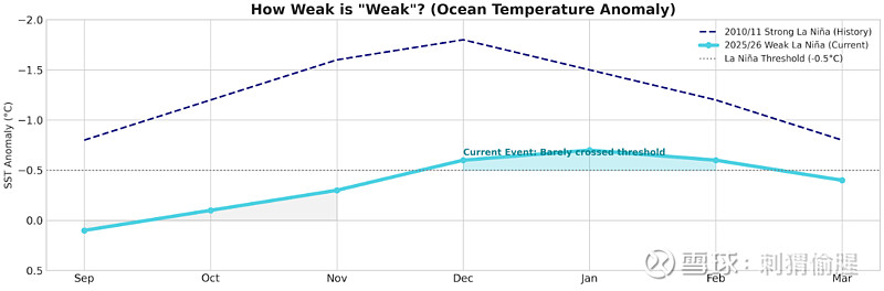 今年这个拉尼娜,是个弱拉尼娜。海水温度低于均值0.5度就是,现在刚刚达到判定为拉尼娜的门槛而已。