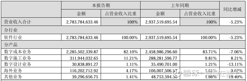 公司营收下降的主要原因是数字成本业务,其毛利率也下降了1.49%,年报中的解释是收入的变动超60% 是由于前期签订云合同分期结转的收入减少所致,第二季度新签云合同降幅已明显收窄,年报中提到成本业务中新业务如指标网、成本测算收入增速超过30%,不清楚新业务占比多少,但反过来可以认为老业务下降超过1.49%,半年报中没有说明用户数量或者项目数量的变化情况。