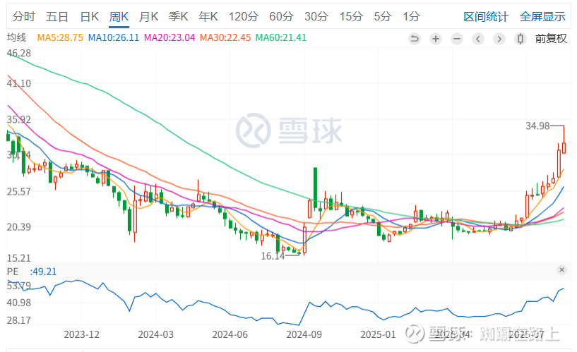 24年初学习了我武生物,网页链接,当时觉得公司营业收入近几年不会大幅上涨,觉得PE超过40太贵。后来确实大幅下跌,但PE最低也有28, 另外可没想到今年上涨的这么好,PE又回到40以上。最近一两个月股价上涨这么多当然有牛市因素,但其自身也还应该有值得买的地方,所以再学习一下。
