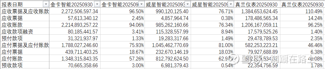 没想到真兰仪表的应收占比最高且应付占比最低。但个人绝对真兰仪表的应付比例才是合理的,毛利率高达40%,原材料费用应该占比不高。三季度报告中没有明细,看24年报,绝对值都比三季度低大约一半,基本都是货款。