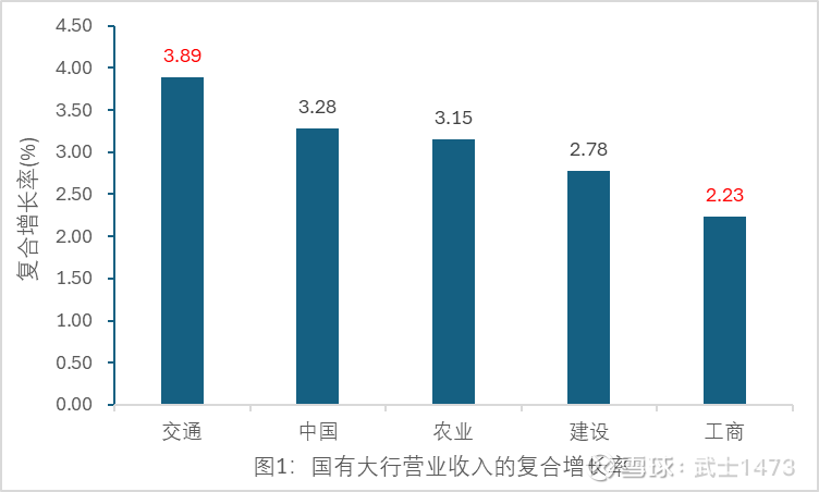图1给出5家国有大行,10年期营业收入“复合增长率”的柱形图。