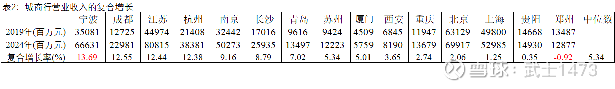 表2给出了15家城商行,2019年~2024年, “营业收入”5年期“复合增长率”,最后1列是中位数。