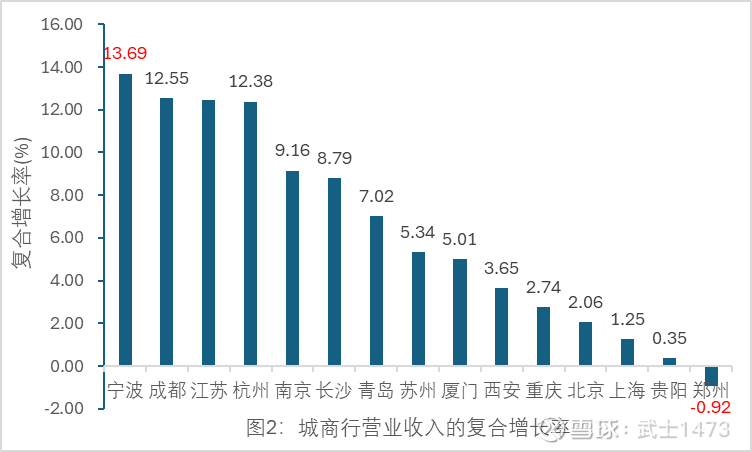 图2给出15家城商行,5年期营业收入“复合增长率”的柱形图。
