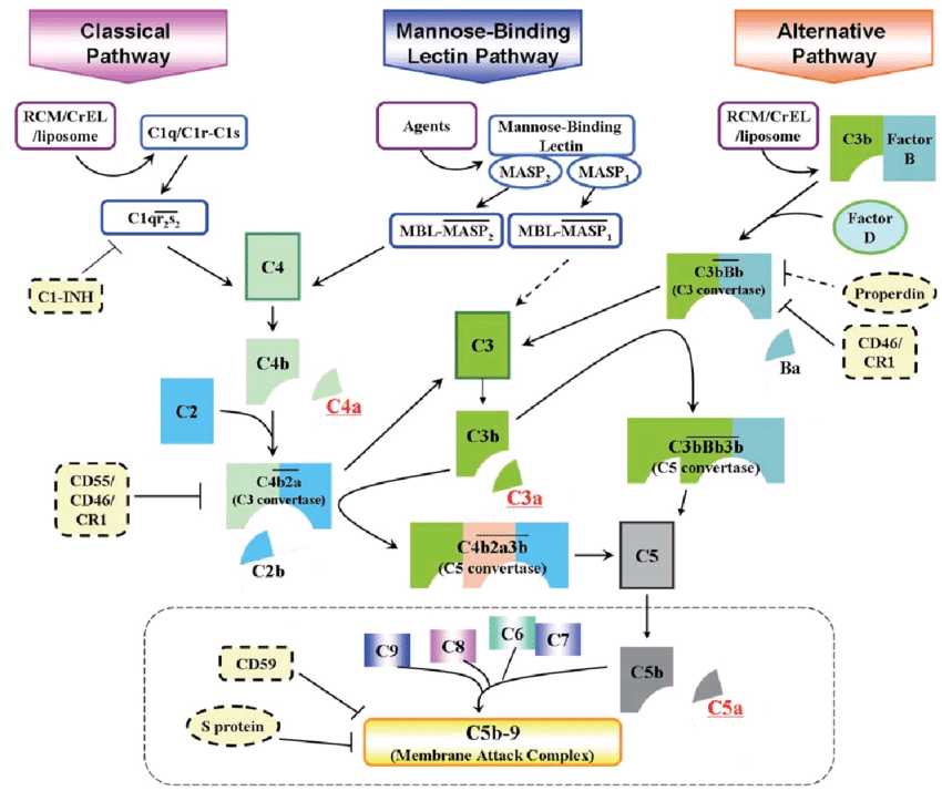 你们已经可以看出这三种路径其实是曲径分叉的花园,既独立又交叉,其中有两个汇聚点,一个是C3,一个是C5。也就是说,如果掐断C3,或者掐断C5,补体系统运转基本就残了。而假如掐断其他点,补体的三途径可能是剪不断理还乱,最后藕断丝连还能坚持发挥作用。