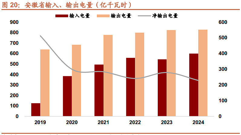 由于省内电力需求迅猛增长,电力供需持续偏紧,近年来外省输入安徽电量同样快速增长,占总用电量比重由 2019 年的5%增长至 2024 年的 17%,2024年这部分电量大概500-600亿,输出减输入,全省净输出电量由 2019 年的 512.84 亿千瓦时下降至 2024年的 228.55 亿千瓦时,但整体安徽还是属于净电力输出省份。