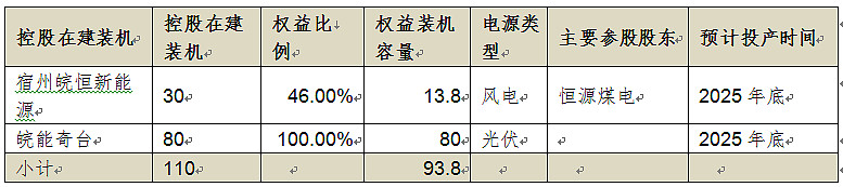 控股有:钱营孜二期100万千火电51%权益Q1增量、安徽省本地在建的若干个风电项目就不计算了,也没去了解具体什么时候完工。吐鲁番50万千瓦风电100%权益全年增量 100%权益、宿迁30万千瓦风电46%权益全年增量、新疆奇台80万千瓦光伏100%权益全年增量,新疆木垒创新风电100万千瓦51%权益全年增量。