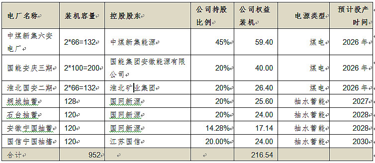 参股国能池州二期132万千瓦火电49%权益H1增量、淮北国安二期132万千瓦火电20%权益全年增量、中煤新集六安66万千瓦机组45%权益H2增量。