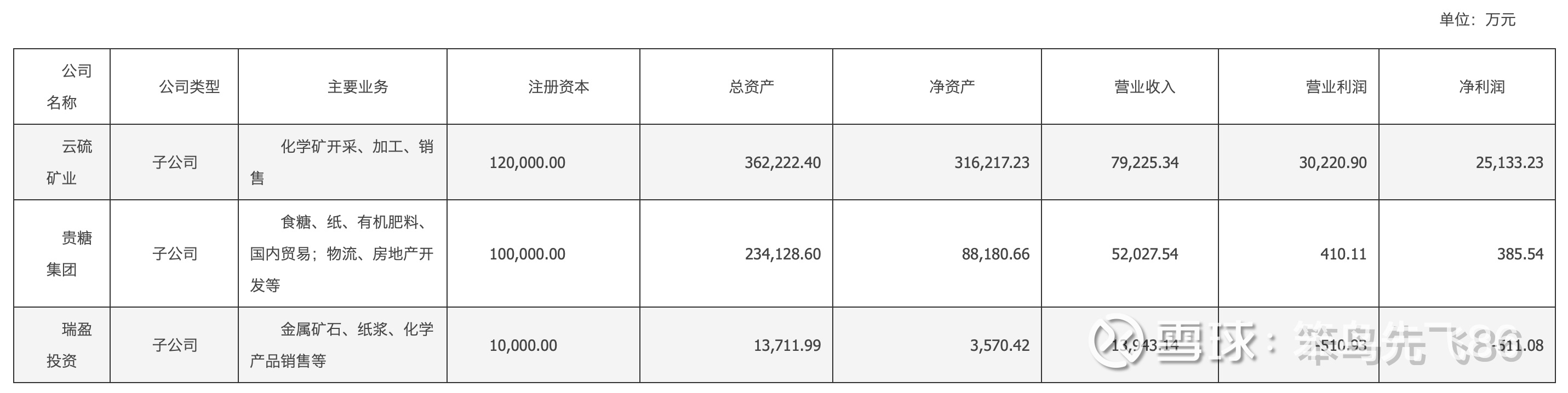 3. 云硫矿业:化学矿开采、加工、销售,是最赚钱的业务,比如硫精矿,硫酸。