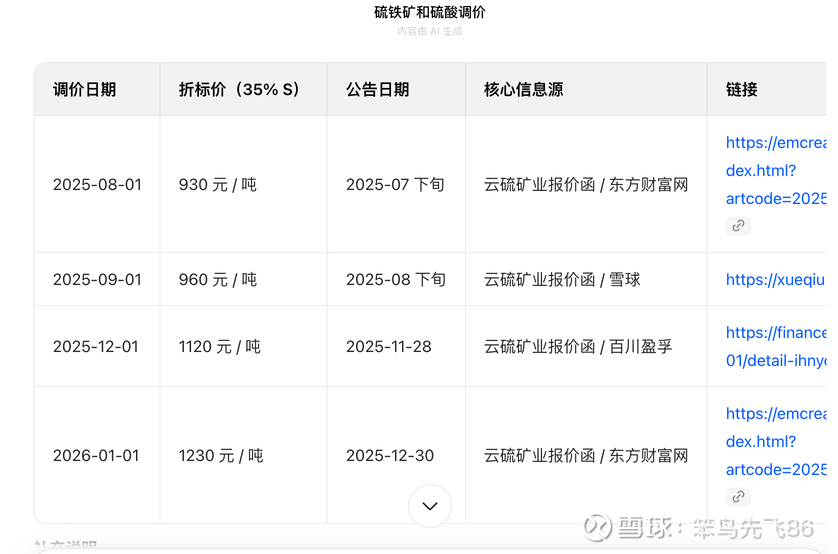1. 硫铁矿价格为1230元/吨,硫酸价格约900元/吨