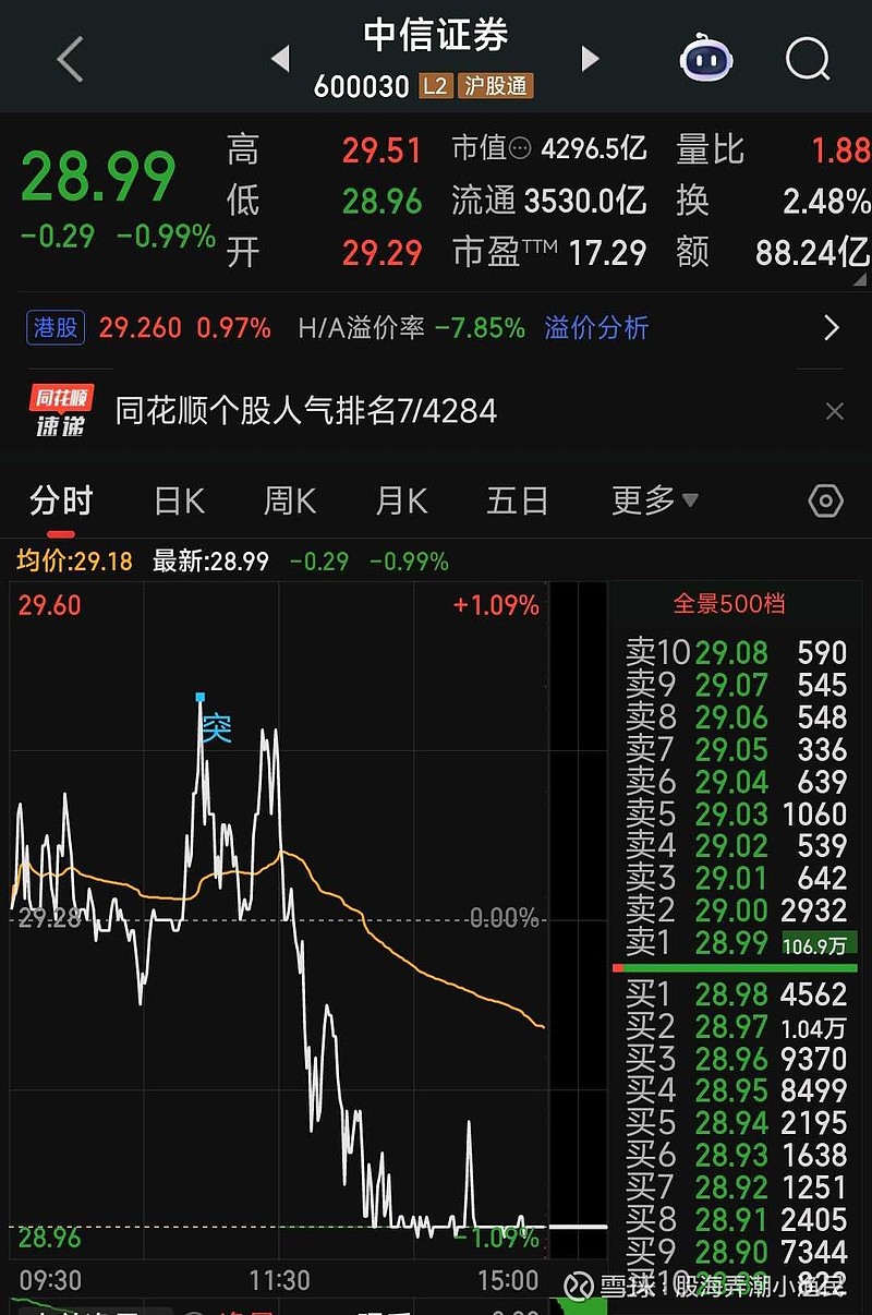 这个必须截个图。中信证券,尾盘卖一107万手,31个亿。无独有偶,国泰海通也有40万手7.6亿卖单压盘。谁能调动这么大的资金,答案不言而喻。今晚美联储极大概率公布降息25基点,有资金想要点火券商,券商一起,4000就近在眼前了。现在来看,GJD态度很明确,希望短期内压制指数节奏,避免券商股过快拉升从而带动指数急速上涨,和慢牛大基调不符。听妈妈的话,别让自己受伤。$中信证券(SH600030)$ $国泰海通(SH601211)$
