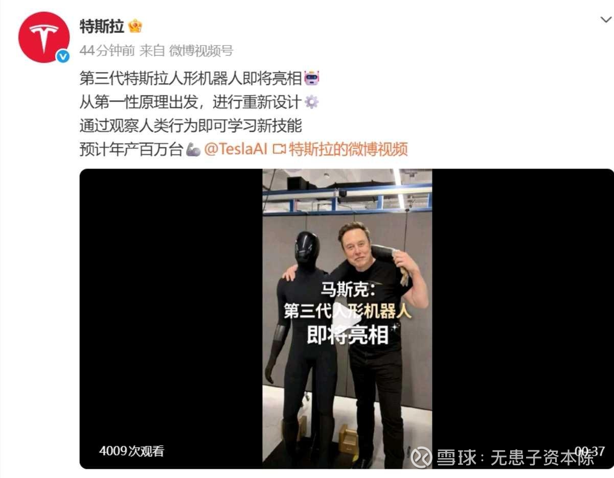 鹏鼎控股2026年2月4日公告(网页链接),为满足公司后续业务发展需要,公司全资子公司庆鼎精密于2026年2月3日竞得淮安市 2025GGK33 地块的国有建设用地使用权,土地面积为374,888.9平方米,土地用途为二类工业用地,成交价格为6614万元人民币。//@无患子资本陈: 2026年2月2日,据特斯拉官方微博消息,第三代特斯拉人形机器人即将亮相,从第一性原理出发,进行重新设计,通过观察人类行为即可学习新技能,预计年产百万台。查看图片