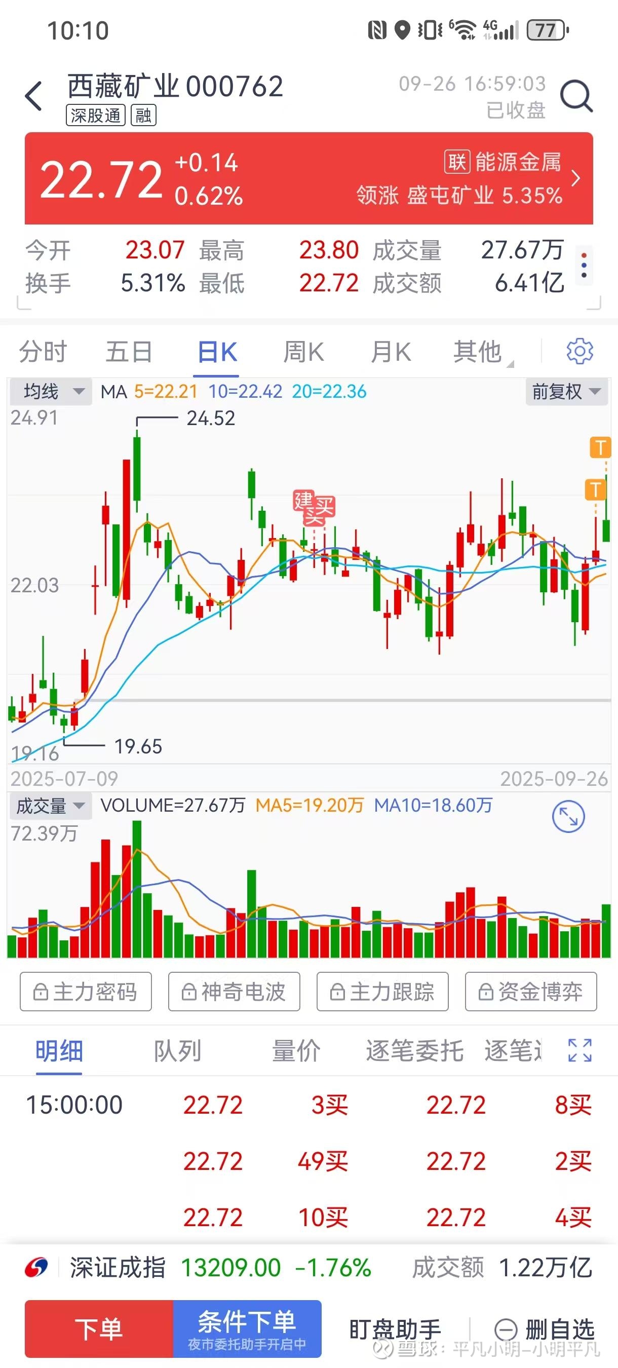 2025年8月中旬,市场开始对碳酸锂相关行业进行炒作,尤其是天齐锂业、赣锋锂业、江特电机等。于是直接建仓赣锋锂业、江特电机、西藏矿业。其中西藏矿业因二期扎尔耶盐湖的综合利用项目因技术攻关还不成熟,价格一直没有起来,坚定耐心持有,持有一个月了,还是没有赚到钱,其实内心也是比较煎熬,因为赣锋锂业和江特电机分别因为固态电池和机器人等行情的带动下,分别浮盈了50%和25%。