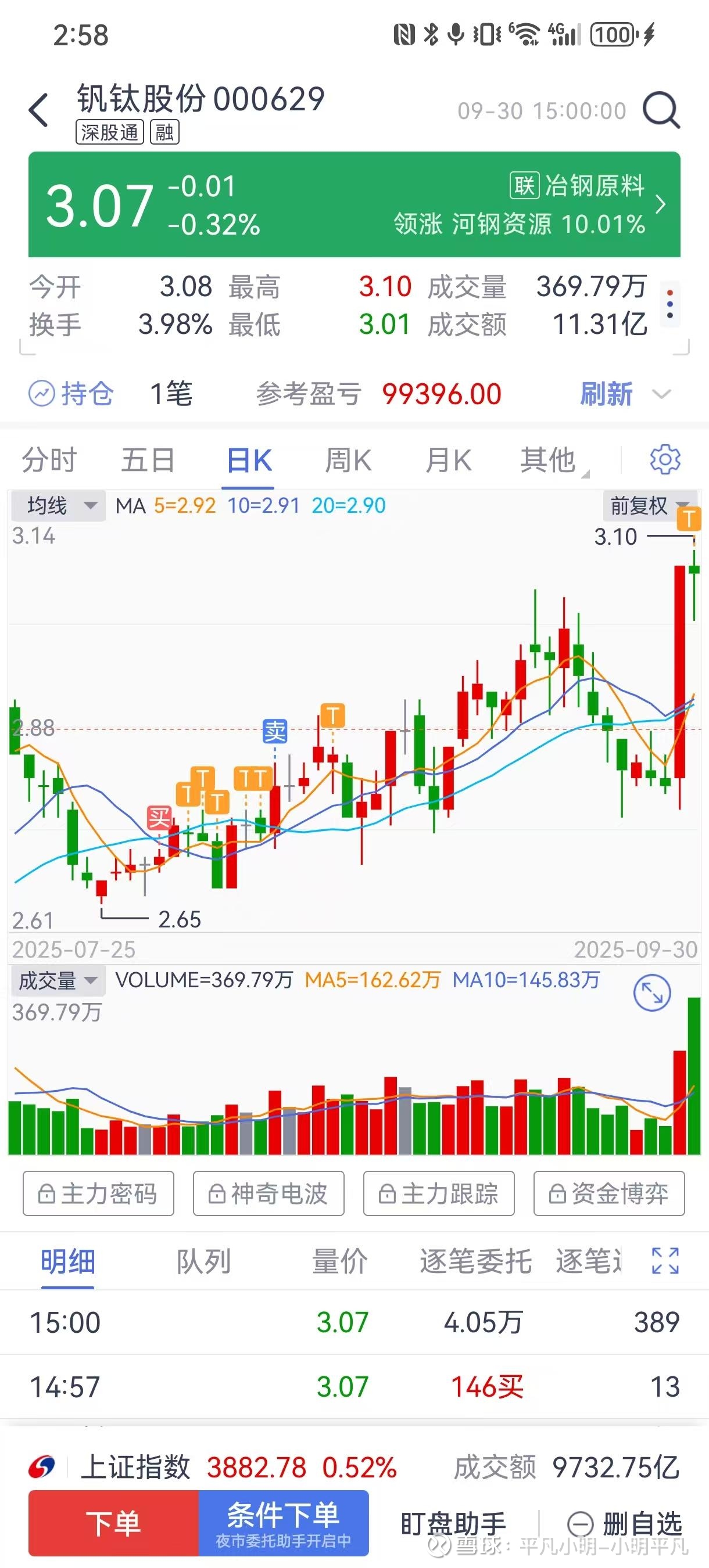 国庆假日前两天,钒钛股份迎来久违的涨停,第二天震荡调整,我的账户已经浮盈了超过10W。从今年3月买入一直被套到现在,一直都没有放弃,坚信它一定会起来。半年过去了,虽然跑输了前面大多数投资者,尤其是买了易中天的投资者。不过,我的钒钛股份已经浮盈了,相信行情已经开始,你们觉得呢?