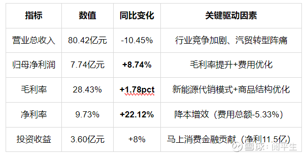 利润逆势增长:通过轻资产转型(汽贸代销)、关停低效门店、供应链优化,抵消收入下滑影响。