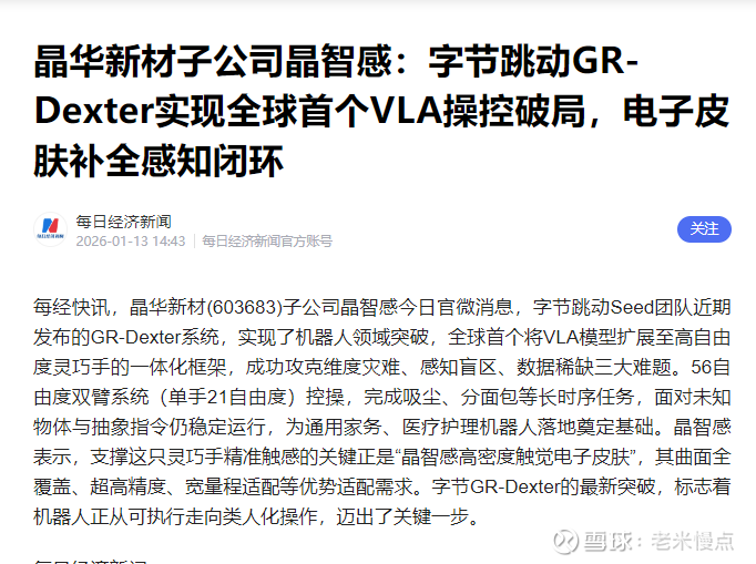 晶华新材(603683)子公司晶智感官微消息,字节跳动Seed团队近期发布的GR-Dexter系统,实现了机器人领域突破,全球首个将VLA模型扩展至高自由度灵巧手的一体化框架,成功攻克维度灾难、感知盲区、数据稀缺三大难题,使用的正是晶智感提供的电子皮肤。