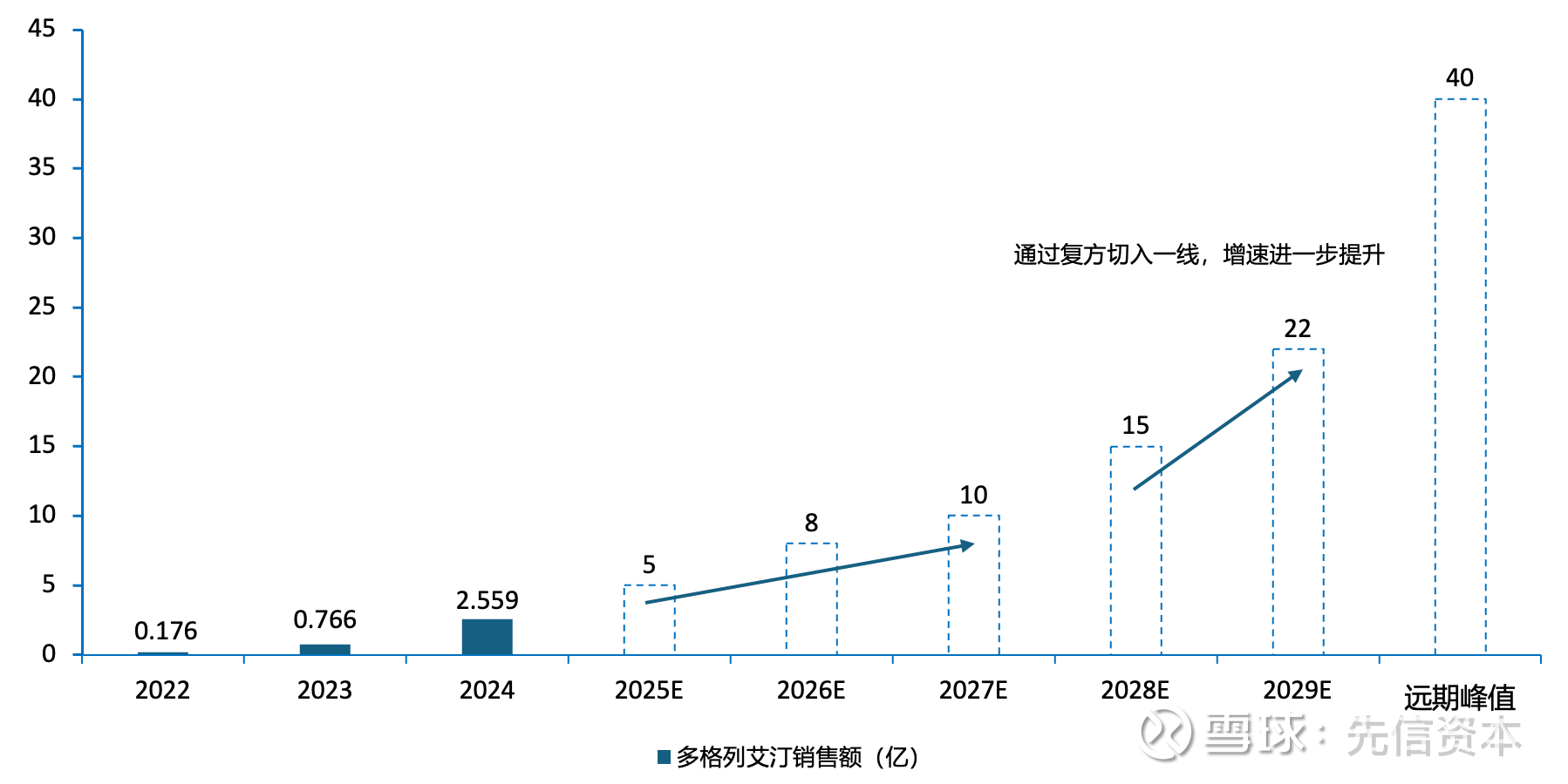 根据中国糖尿病防治指南,T2DM的1线治疗目前仍以二甲双胍为主,对于超重或肥胖患者采用GLP-1/SGLT2i等具有减重作用的降糖药。作为长期以来的基石药物,二甲双胍应用人群基数极大,2025年总人群达到5800万之多。复方制剂的获批,将帮助多格列艾汀加速切入这一庞大的市场,提升销售增速,推动销售峰值从20亿→40亿。