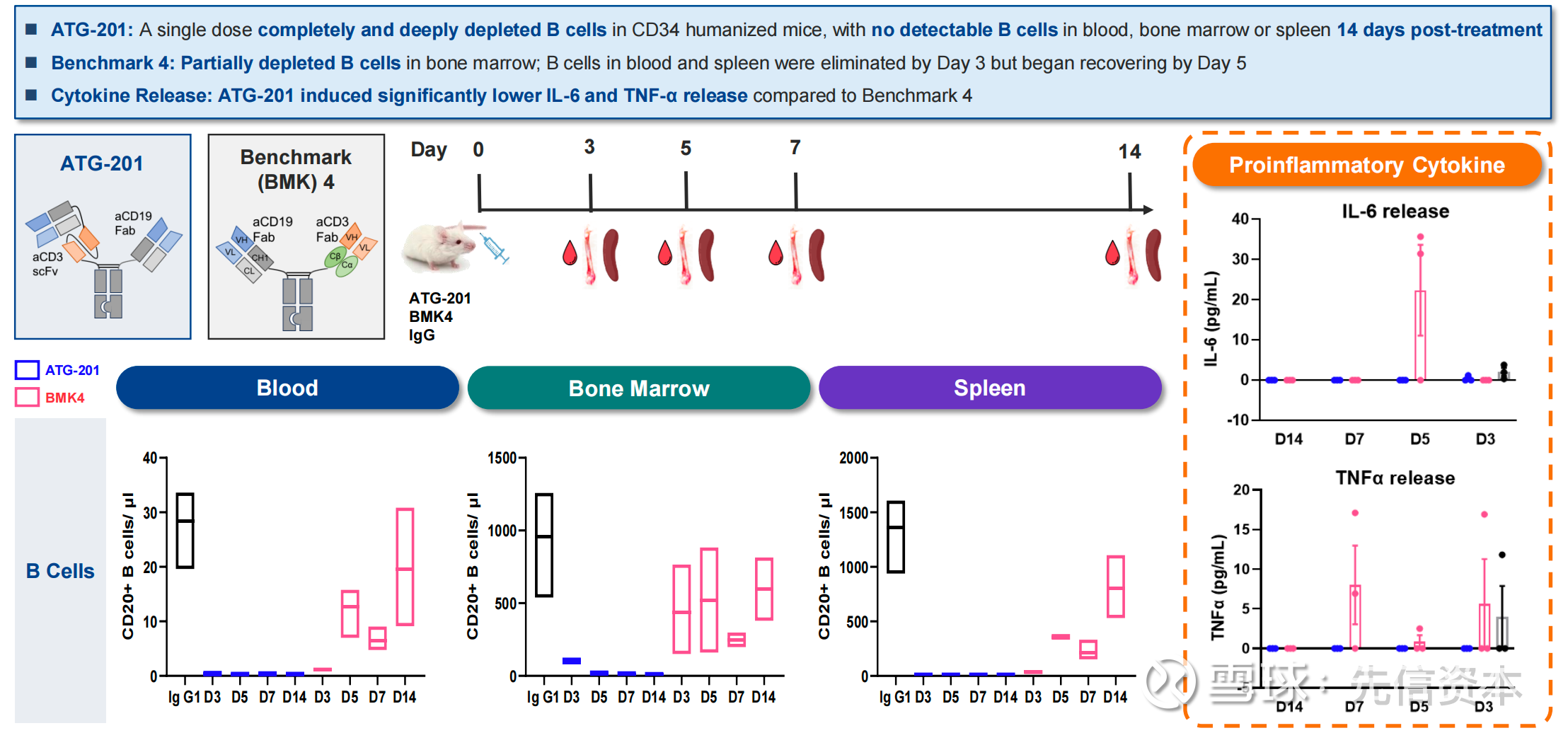 1. ATG-201(CD19xCD3,计划25Q4 IND):MSD于2024年8月收购同润临床前CD19xCD3 TCE CN201,交易对价13亿美元,其中首付款高达7亿美元。临床前模型中,ATG-201显示较CN201具有更深且更持久的体内B细胞清除,同时安全性更佳。ATG-201潜在BD价值可对标CN201,预计首付款超7亿美元,仅首付款就约等于2个德琪的市值。