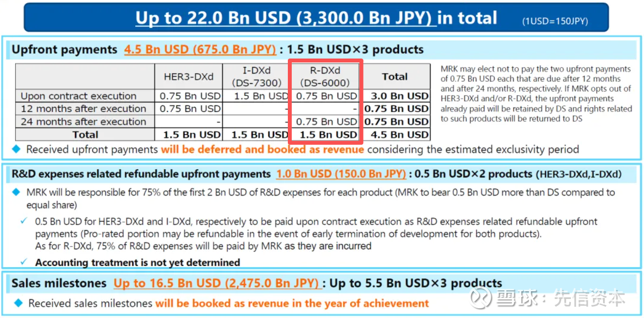 2. ATG-106(CDH6xCD3,计划27Q1 IND):MSD于2023年10月引进第一三共三款ADC(一款为CDH6 ADC R-DXd),BD早期付款45亿美元。第一三共对于合约进行拆分,R-DXd对应的早期付款为15亿美元,合同执行后立即支付7.5亿美元。ATG-106与R-DXd同为FIC,且适应症均为卵巢癌+肾癌,BD价值可以相互对标。鉴于ATG-106处于临床前,而R-DXd授权时处于临床I期,保守预估ATG-106首付款不低于R-DXd的40%,即>3亿美元。