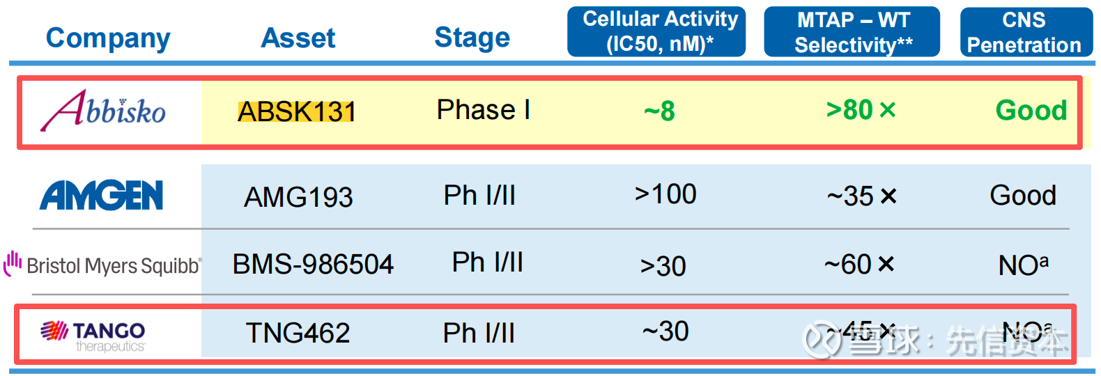 和誉的ABSK131是第二代小分子PRMT5/MTA协同抑制剂,靶向MTAP基因缺失的实体瘤,2024 ENA大会将其列为潜在的BIC药物。ABSK131针对多项实体瘤的I期初步数据计划将在26H2读出。临床前数据显示,ABSK131相比vopimetostat,在细胞活性、选择性和入脑性方面表现更佳。