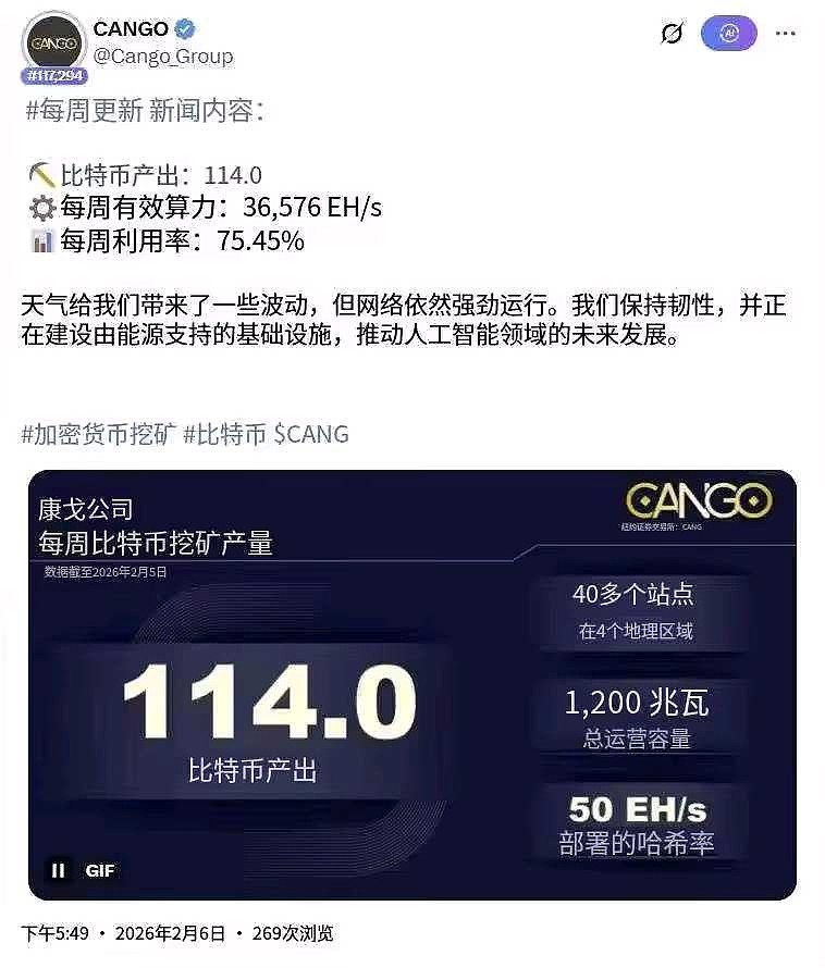 $灿谷(CANG)$ 继续同步下灿谷最新的挖饼数据。二月首周灿谷产出大饼:114枚BTC有效算力:36.576EH/s设备利用率:75.45%算力下降的原因主要是由于天气带来的,不过能在恶劣天气情况下做到75%利用率还是不错的。对此灿谷官方表示:天气状况给我们带来了一些小波折,但网络依然稳定运行。我们将持续保持韧性,打造以能源为支撑的基础设施,为人工智能的下一个发展阶段提供动力。保持原有判断,今晚看灿谷反弹