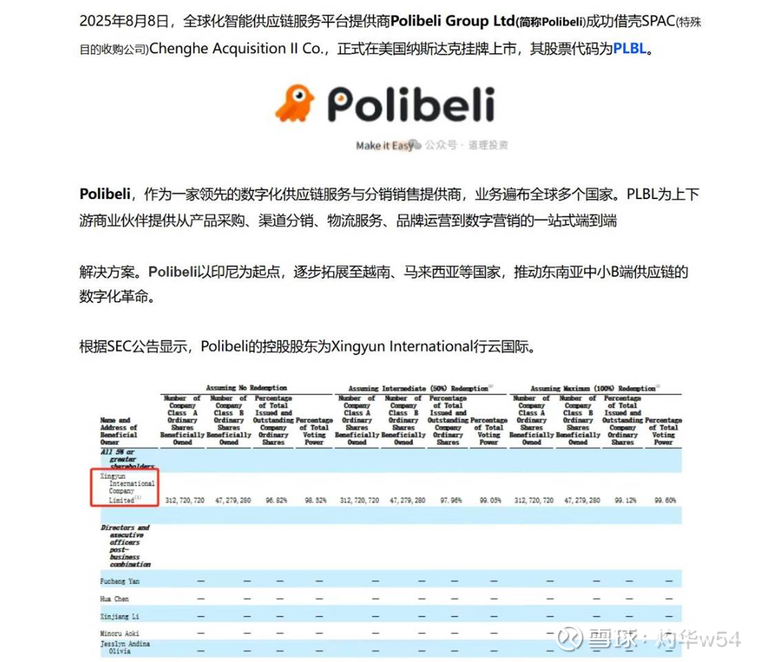 Polibeli是天行云的子公司,25年8月Polibeli与Chenghe Acquisition II Co.完成了36亿美元的SPAC上市(借壳,这一点很重要,为后续天行云入主有棵树提供很有意义的参考),目前Polibeli的市值为34亿美元。