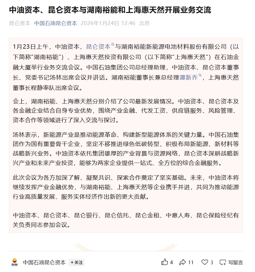 中国石油集团公司总经理助理,中油资本、昆仑资本董事长、党委书记汤林出席会议并讲话。湖南裕能董事长兼总经理谭新乔,上海惠天然董事长程静率队出席会议。