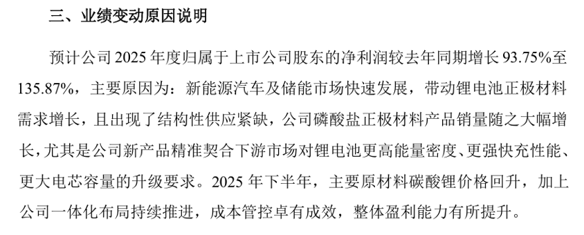 湖南裕能预计2025年净利润为11.5亿元-14亿元,同比增长93.75%-135.87%。Q4归母6.3亿,环比接近翻倍。