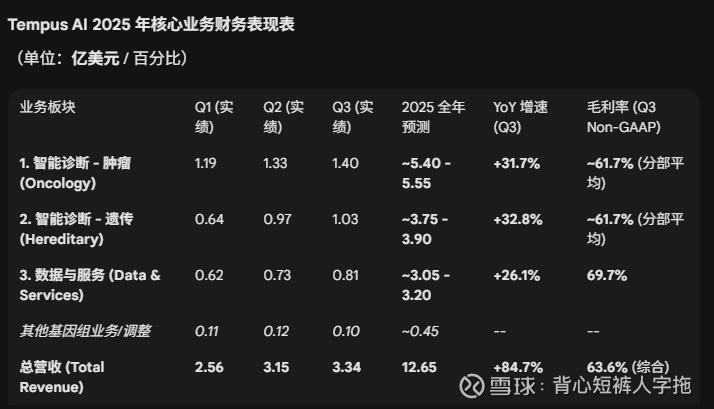 现状: 2025 年 Q3 营收已突破 3.3 亿美元,检测量同比大幅增长。这部分业务的作用是:通过服务医生获取患者最核心的分子数据,并将数据源源不断地导入其数据库。