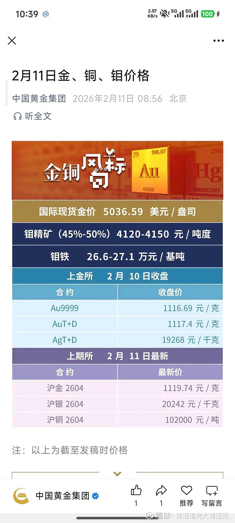 因为买了中金黄金所以关注了中国黄金集团的gzh这个号定期发布金,铜,钼的价格钼精矿价格确实在涨今年Q2新疆那个钼矿的出让结果就会出来金钼股份也是个好公司其实好公司很多但人的资金有限不可能全都买至于哪个后面涨的多,事前根本没法预测纯靠运气罢了所以,平常心,放低期望金钼股份我也卖飞了的