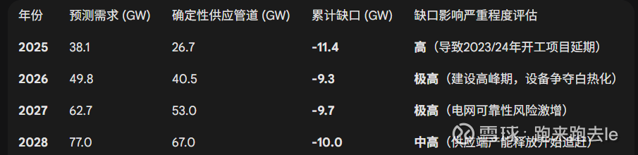 缺口量化: 到2028年,美国数据中心预计需要新增约44GW的容量,但目前可见的确定性供应仅约25GW,留下至少19GW的硬性缺口 。