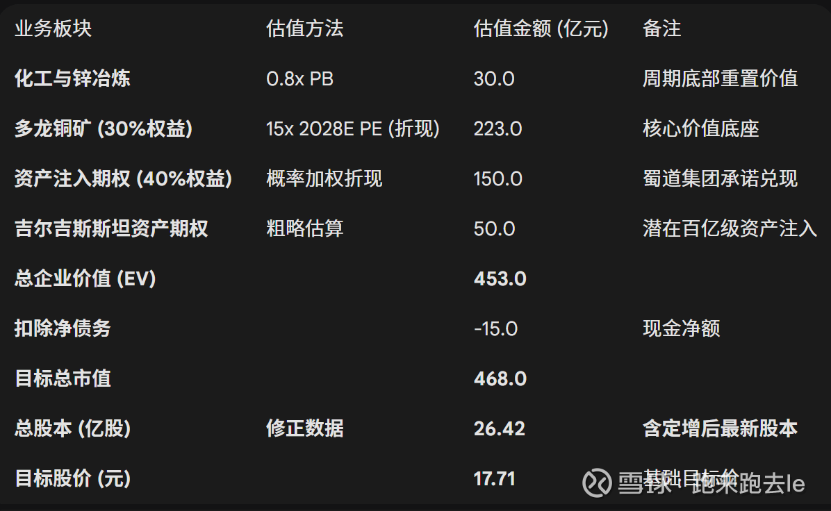 参数:基于2028年稳态利润(22亿元归母中的约18亿来自铜矿)。给予矿业成长股典型的15倍PE。