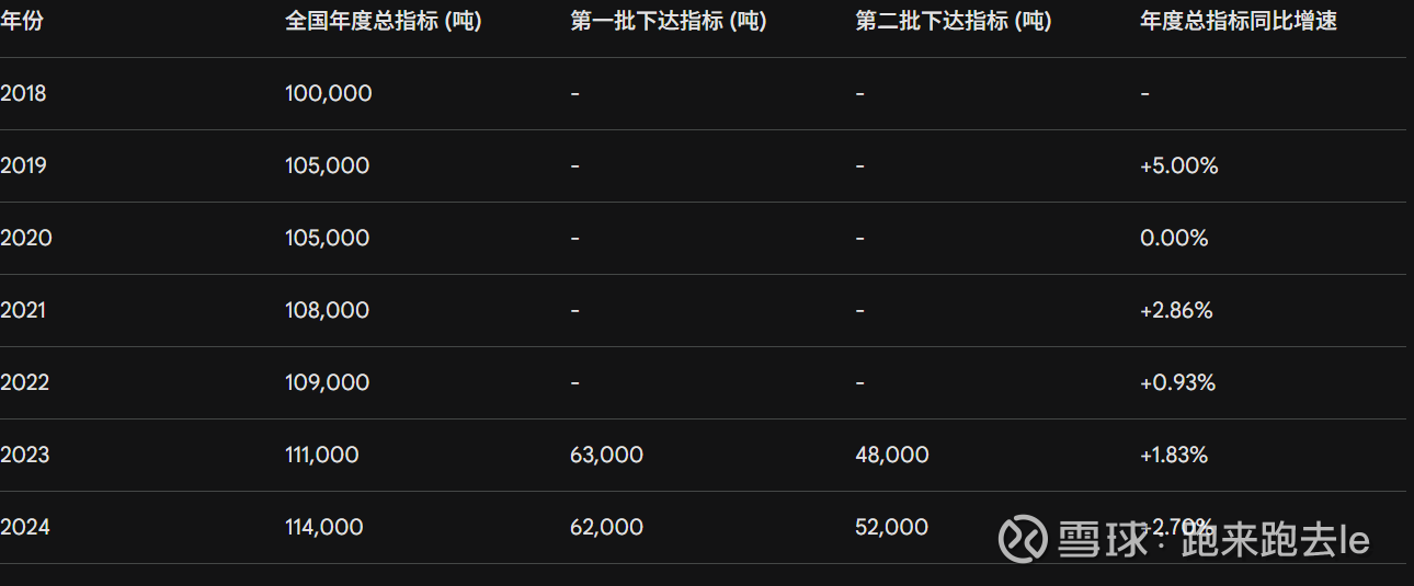 指标总量的见顶特征十分明显:2021年全国指标为108,000吨,2022年微增至109,000吨,2023年达到111,000吨,至2024年则设定在114,000吨 。这四年的年均复合增长率(CAGR)仅为1.8%左右,远低于下游战略新兴产业需求的增速。2024年的114,000吨指标分为两批次下达,其中第一批下达62,000吨,第二批下达52,000吨 。