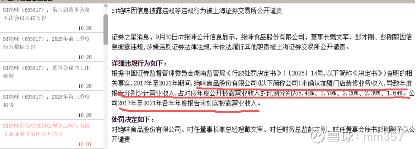 先来看“ST绝味”的戴帽原因:它因2017 - 2021年未确认加盟门店装修业务收入致财报少计营收(财务造假),涉嫌信披违规被实施其他风险警示,2025年9月30日收到了《行政处罚决定书》。而非是业绩问题。