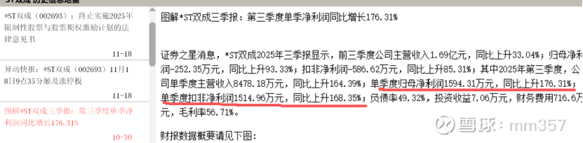 *ST松发摘帽概率极高,2025年完成重大资产重组后基本面彻底改善,前三季度业绩已远超摘帽财务标准。这个在我11月8日的帖子《并购重组之后业绩暴增!! 这支ST股是否具备跟寒武纪同样的潜力》(网页链接)中有详细分析。