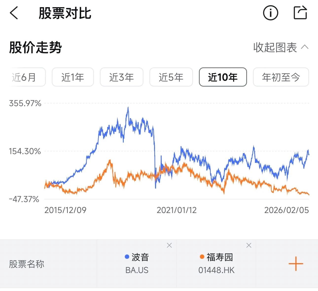 但现实市场却经常给出相反的答案,下面是波音公司和港股殡葬行业龙头福寿园的股价表现以及近10年走势对比图。