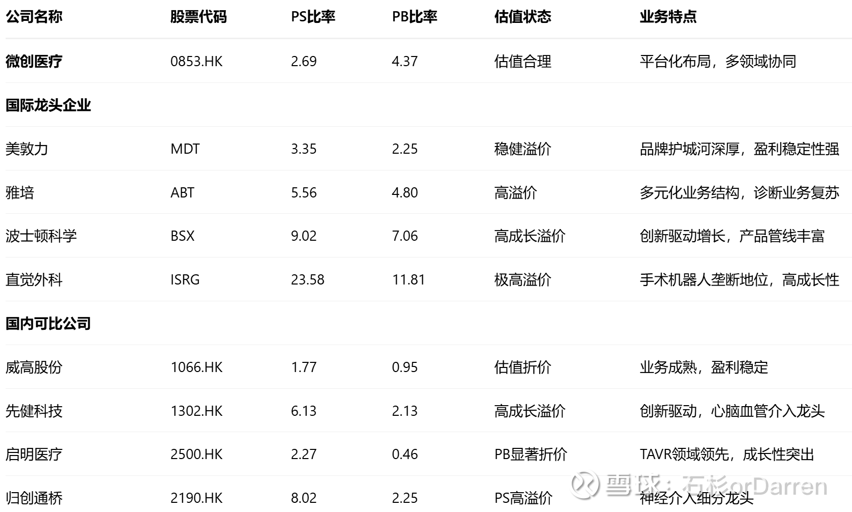 合理估值层(2-5倍):微创医疗(4.37倍)、归创通桥(2.25倍)、美敦力(2.25倍)