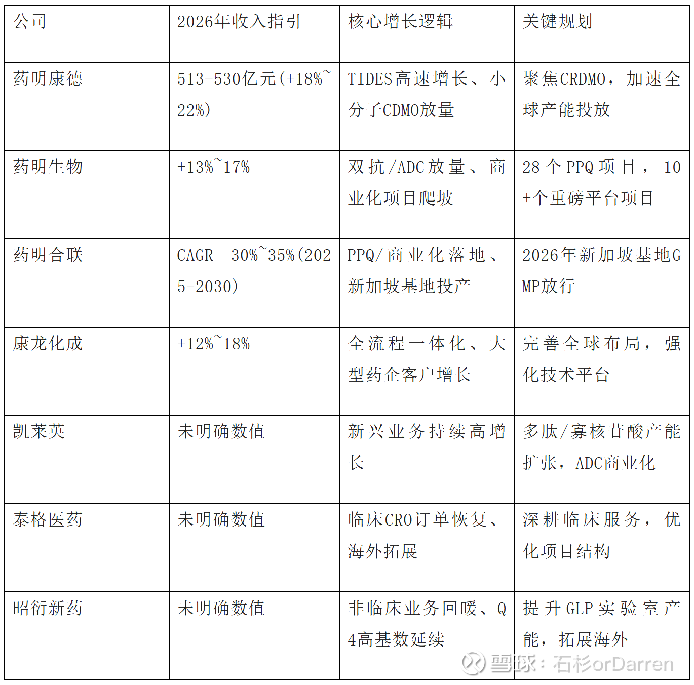 高增长预期:药明合联(30%+)、药明康德(18%+)、康龙化成(12%-18%)、药明生物(13%-17%)领跑,受益于ADC/多肽/双抗新兴赛道爆发。
