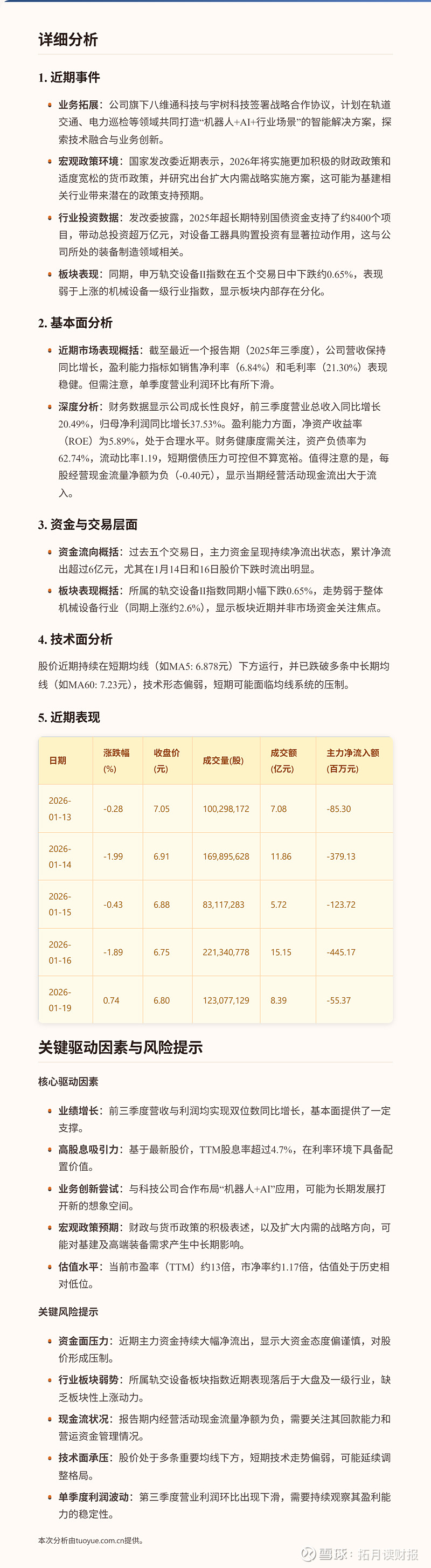 $中国中车(SH601766)$ 过去一周,中国中车股价呈现震荡下行态势,五个交易日中有四日下跌,累计跌幅约3.8%。股价表现主要受到市场整体情绪及所属轨交设备板块走弱的影响,同时资金面呈现持续净流出状态。值得关注的是,公司近期在“机器人+AI”领域展开战略合作,探索新业务增长点,且当前估值水平与股息率具备一定吸引力。