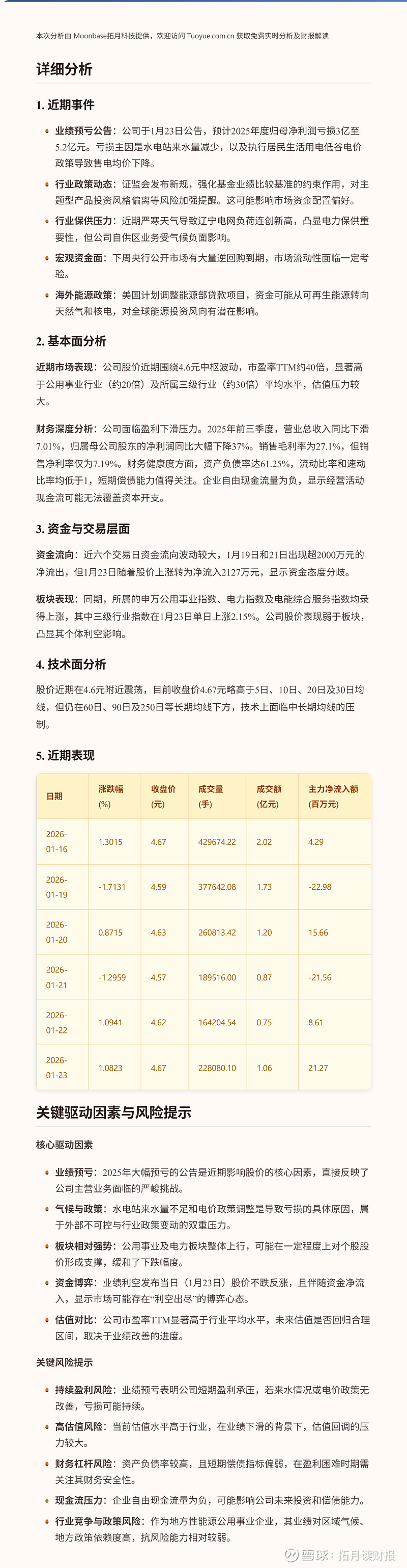 $广安爱众(SH600979)$ 广安爱众近期股价在4.6元附近窄幅震荡,整体表现平稳。核心驱动因素是公司发布2025年度业绩预亏公告,预计亏损3至5.2亿元,主要受来水量减少及电价政策调整影响。同时,公用事业板块整体表现优于个股,显示公司面临特定经营压力