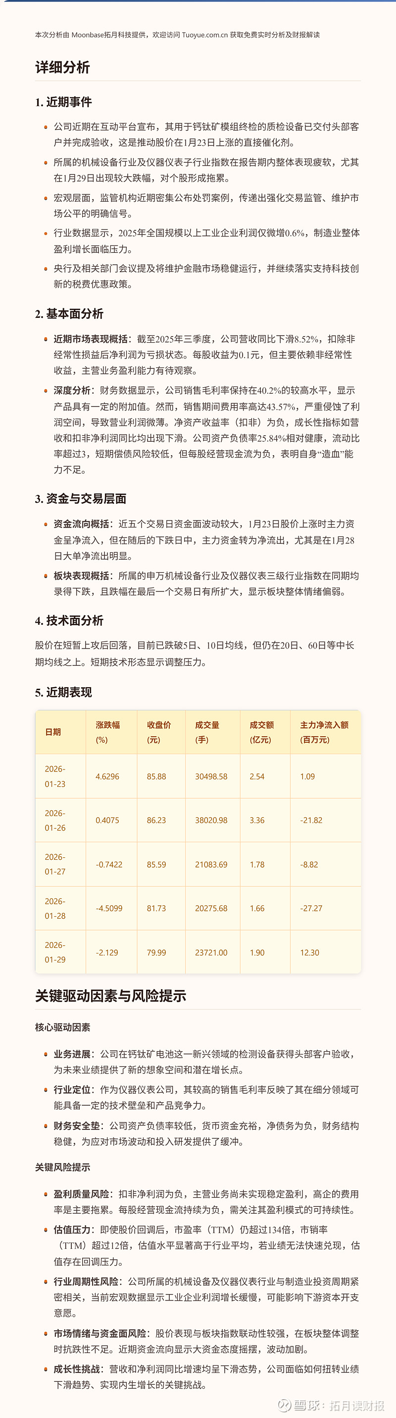 $荣旗科技(SZ301360)$ 荣旗科技股价在最近五个交易日呈现冲高回落态势,周初受其钙钛矿检测设备交付头部客户的消息提振,股价一度上涨,但随后跟随机械设备板块整体调整而连续下跌。关键亮点在于公司在新兴钙钛矿电池检测领域取得实质性业务进展。值得关注的是,公司当前市盈率估值较高,且最新财务数据显示其扣非净利润为负,盈利能力面临挑战。【欢迎点赞关注反馈!主页有更多精彩解读和分析哦~】