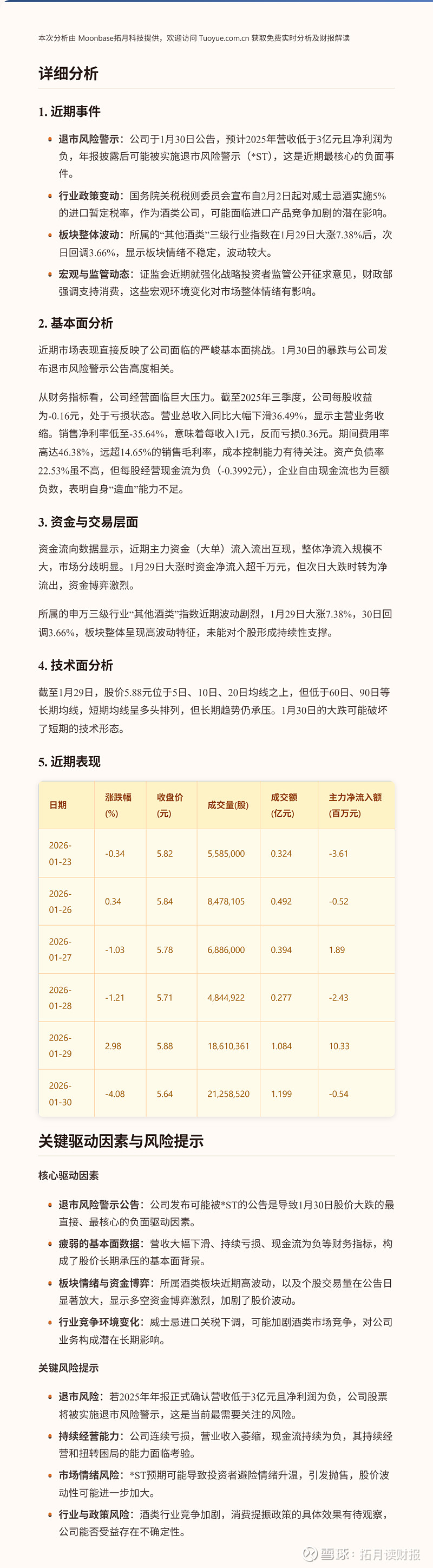 $莫高股份(SH600543)$ 莫高股份近期股价波动剧烈,1月30日单日下跌超4%,全周累计下跌约3.4%。股价表现主要受到公司发布可能被实施退市风险警示(*ST)公告的直接影响,该消息引发了市场对公司基本面的担忧。关键问题点在于公司2025年预计营收不达标且净利润为负,面临退市风险。【欢迎点赞关注反馈!主页有更多精彩解读和分析哦~】