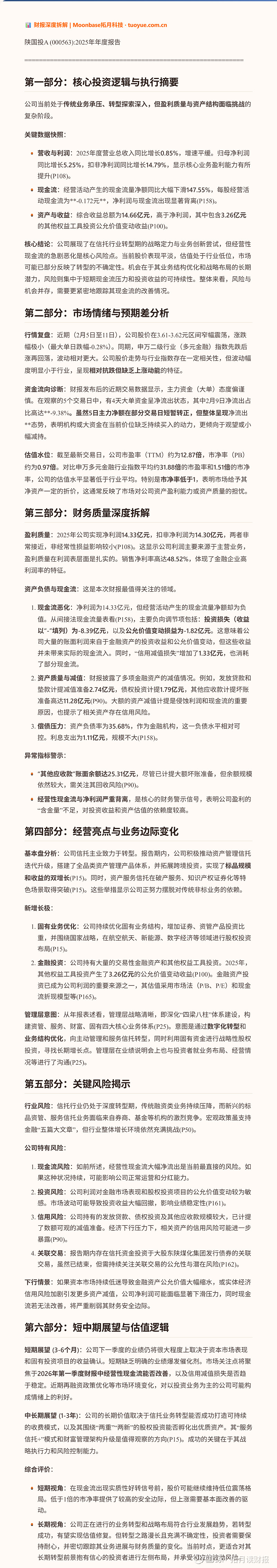$陕国投A(SZ000563)$ 2025年年度报告深度解读【🎯 关注我,获取更多实时深度分析!点赞反馈,精彩内容尽在主页置顶~】公司当前处于传统业务承压、转型探索深入,但盈利质量与资产结构面临挑战的复杂阶段。公司下一季度的业绩仍将很大程度上取决于资本市场表现和固有投资项目的收益确认。短期缺乏明确的业绩爆发催化剂。市场关注点将聚焦于2026年第一季度财报中经营性现金流能否改善,以及信用减值损失是否趋于稳定。近期再融资政策优化等市场环境变化,对以投资业务为主的公司可能构成情绪上的利好。