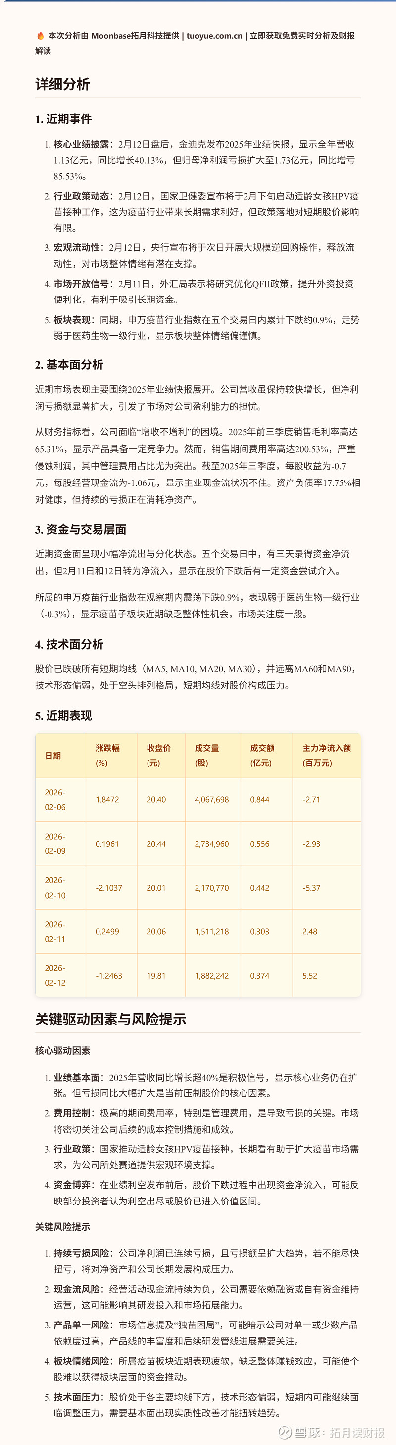 $金迪克(SH688670)$ 【🎯 关注我,获取更多实时深度分析!点赞反馈,精彩内容尽在主页置顶~】金迪克近期股价在20元附近窄幅震荡,五个交易日内累计下跌约1.1%。股价表现主要受到公司2025年业绩快报披露的持续亏损影响,尽管营收实现增长,但亏损额同比扩大。同时,疫苗行业板块整体表现平淡,未能提供有力支撑。