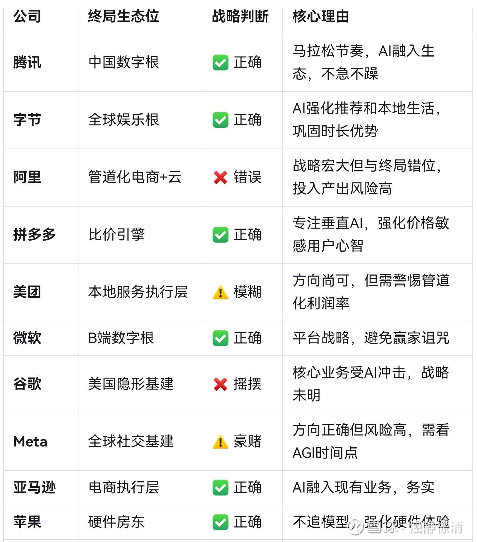 需要警惕的是那些战略与终局错位、或面临根本性困境的公司:阿里(入口梦)、谷歌(搜索被颠覆)、OpenAI(赢家诅咒)。