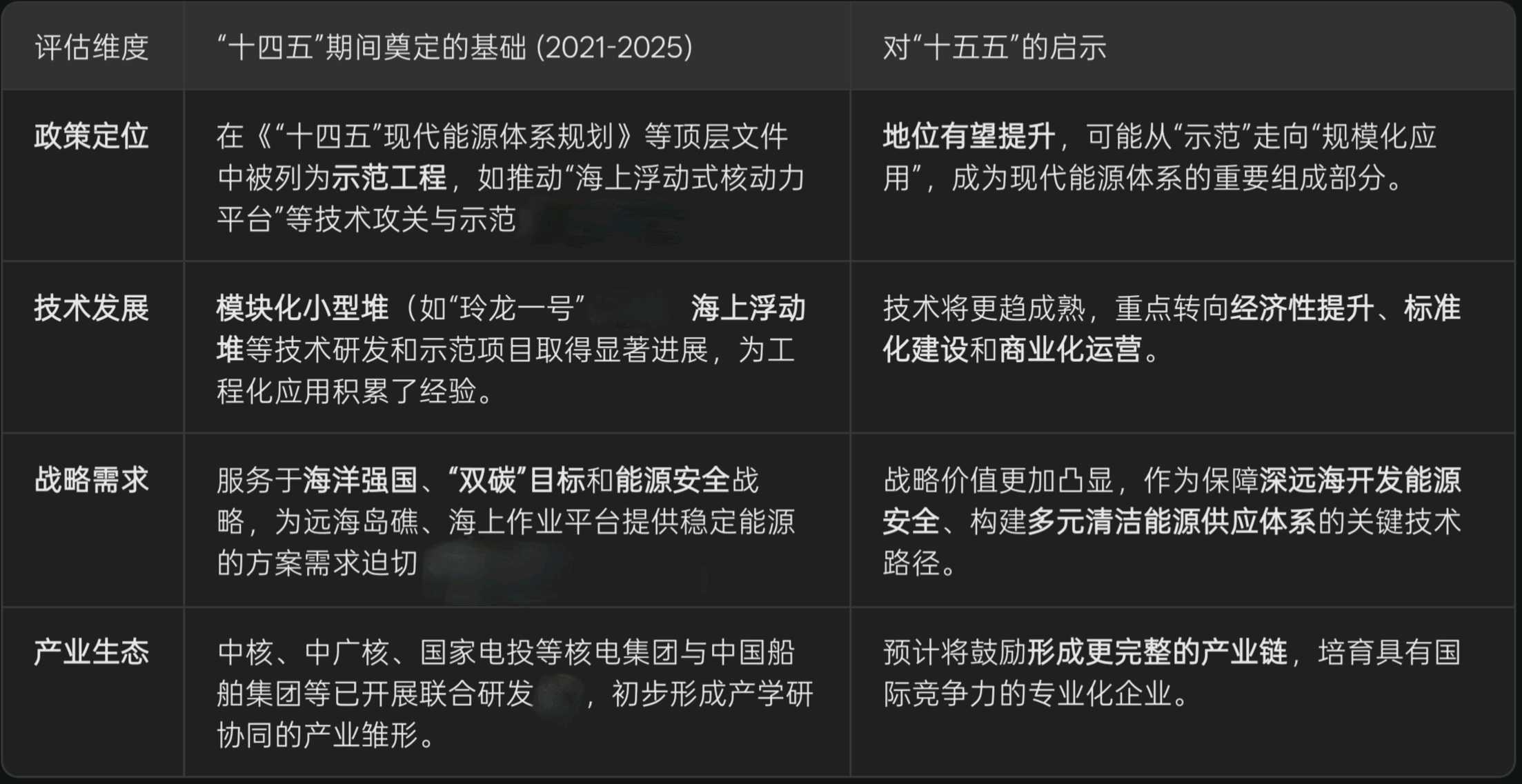 基于当前的政策导向和技术发展态势, 海洋核电 (特别是海上浮动式核电站等先进技术) 有较大希望在“十五五”规划中获得明确的定位和支持。以下表格梳理了“十四五”期间已为海洋核电发展打下的基础: