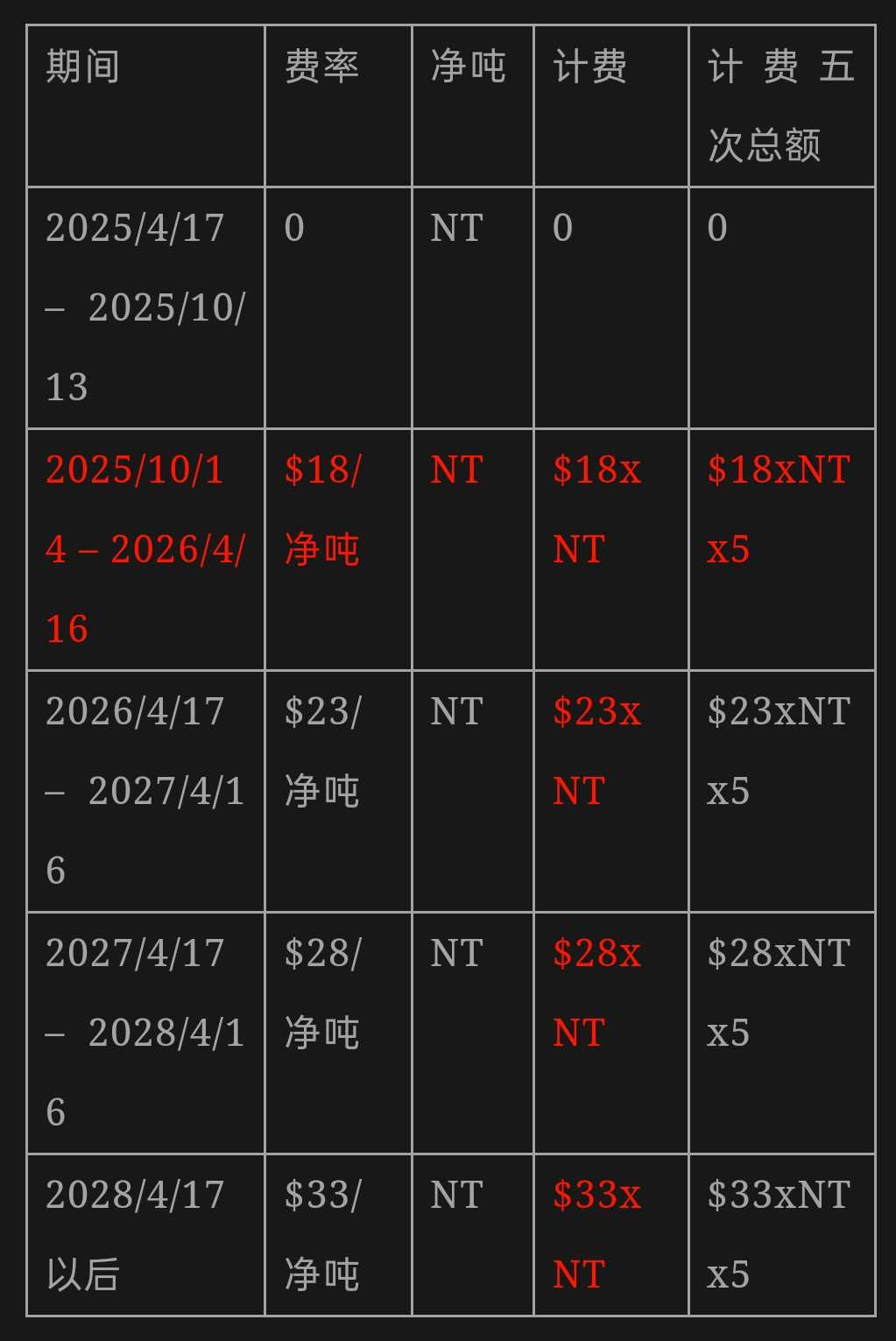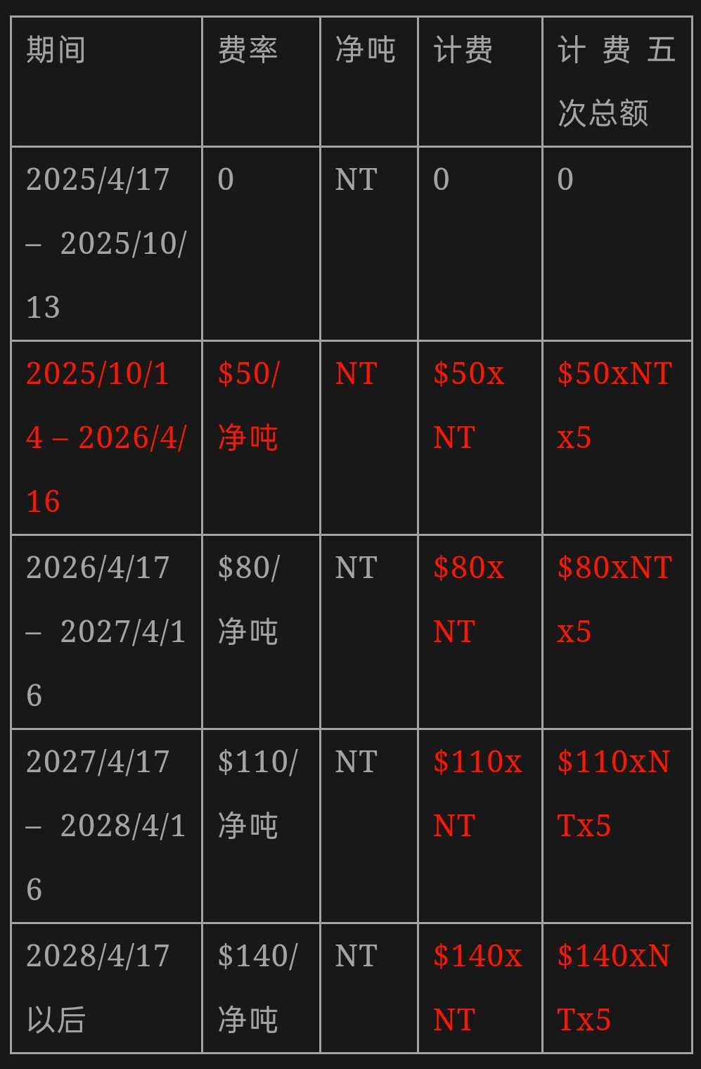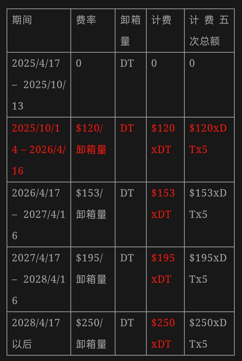 对于经营美国航线的中国船舶经营人和船舶所有人,当其经营的船舶自10月14日起抵达美国港口时,则应按附件一征收服务费如下表: