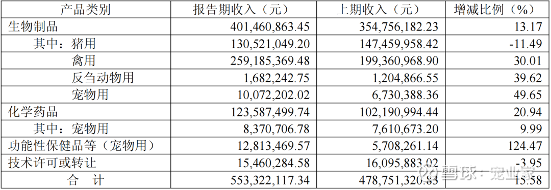 普莱柯各类别产品具体销售数据显示,生物制品中的宠物业务报告期内营收1007万元,相比去年同期增长49.65%;